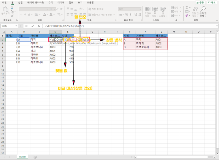 J2:L4(오른쪽 표): 이 표에서 값을 찾겠다는 뜻)